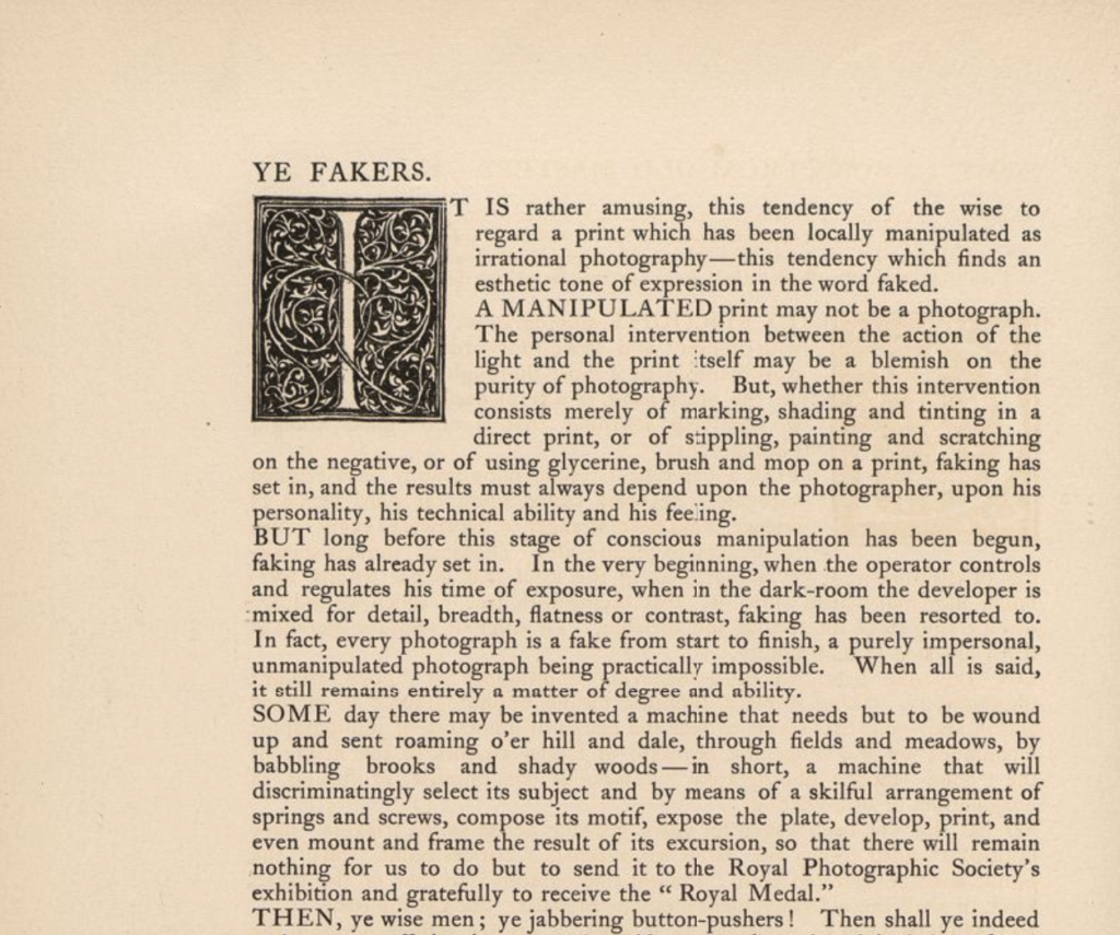 Edward Steichen was another pictorialist of the era who often worked with Stieglitz on his publications and exhibitions. Read “Ye Fakers,” Steichen’s spirited defense of the pictorialist style of art and his response to the notion that all pictorialist works were “faked.”